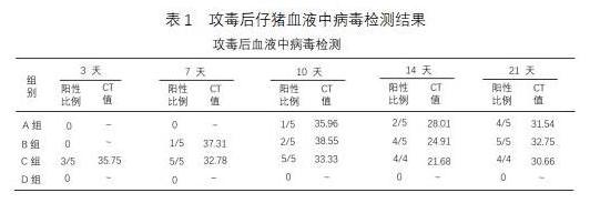從試驗結(jié)果可見:陰性對照組全程血清PRRSV CT值陰性,而陽性對照組每3天有3頭陽性,第7天全部轉(zhuǎn)為陽性,說明攻毒造模劑量是合適的。